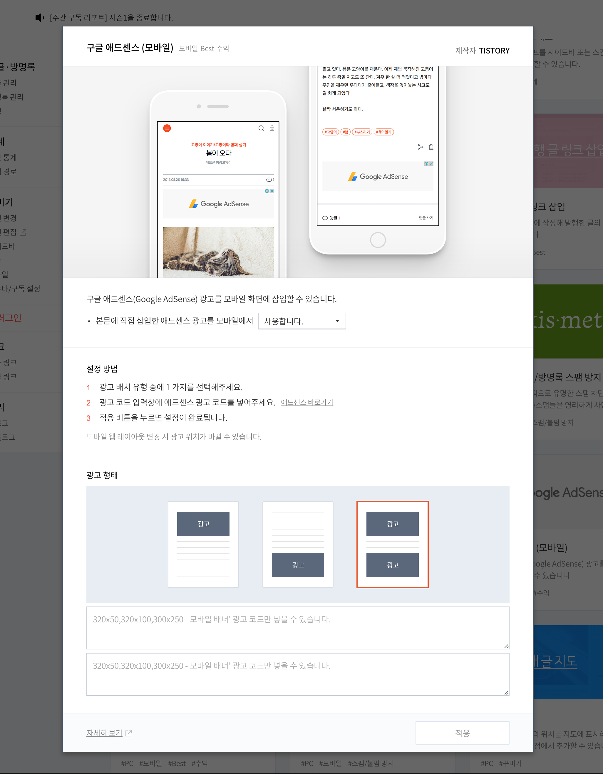 위에 있는 이미지에서 보면 설정방법2번에 애드센스 광고 코드를 넣어주세요. 라고 되어 있는데