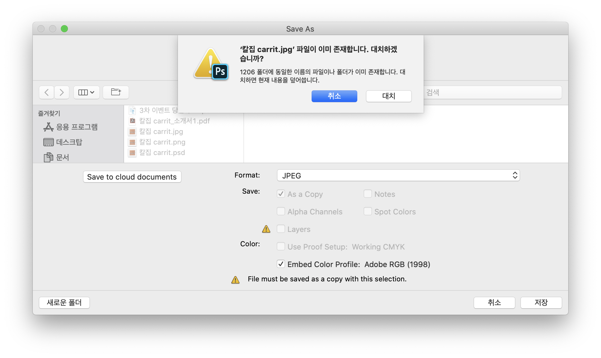 경고창은 파일이 이미 존재한다고 그러니 지금 저장하는 파일로 대치하겠습니까? 하고 물어봐서
