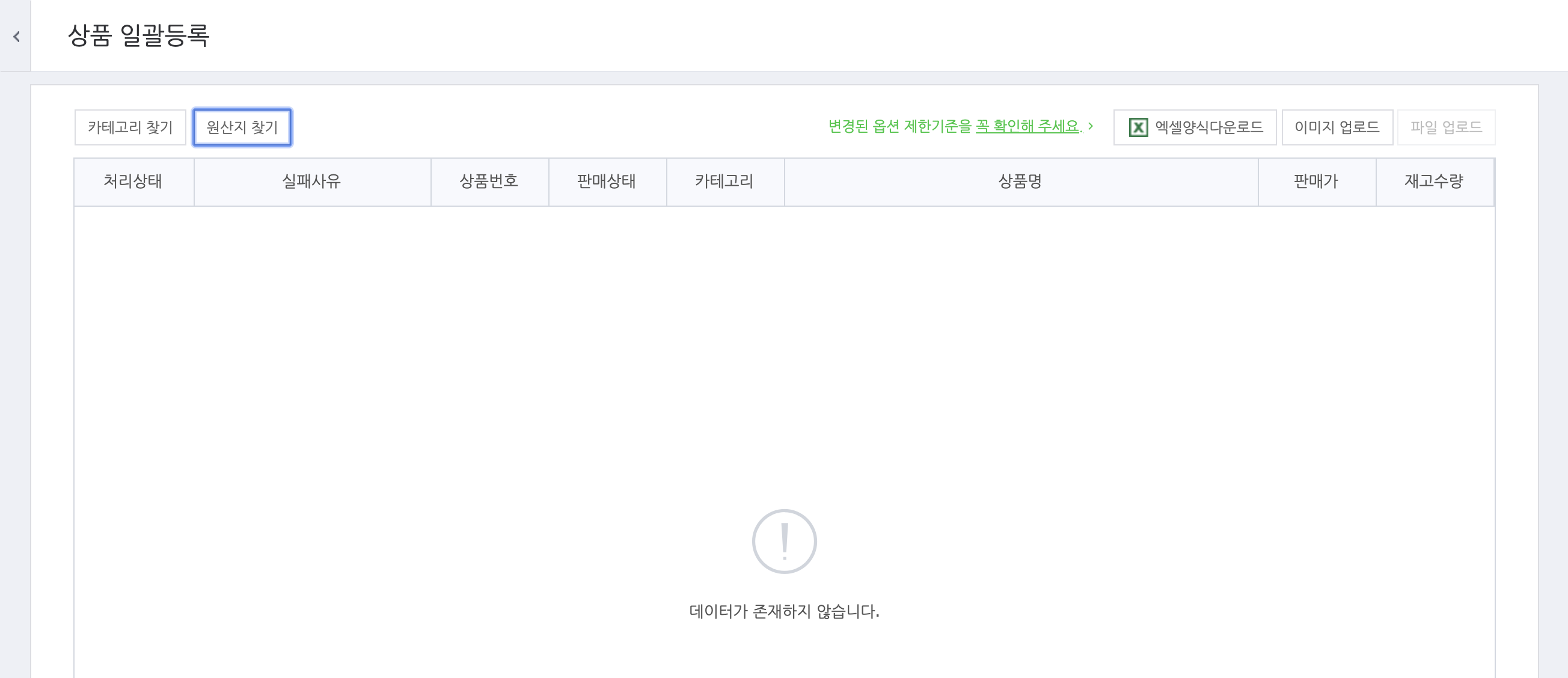 "상품 일괄등록" 창 왼쪽 위에 '카테고리 찾기'와 '원산지 찾기' 둘다 있더라.