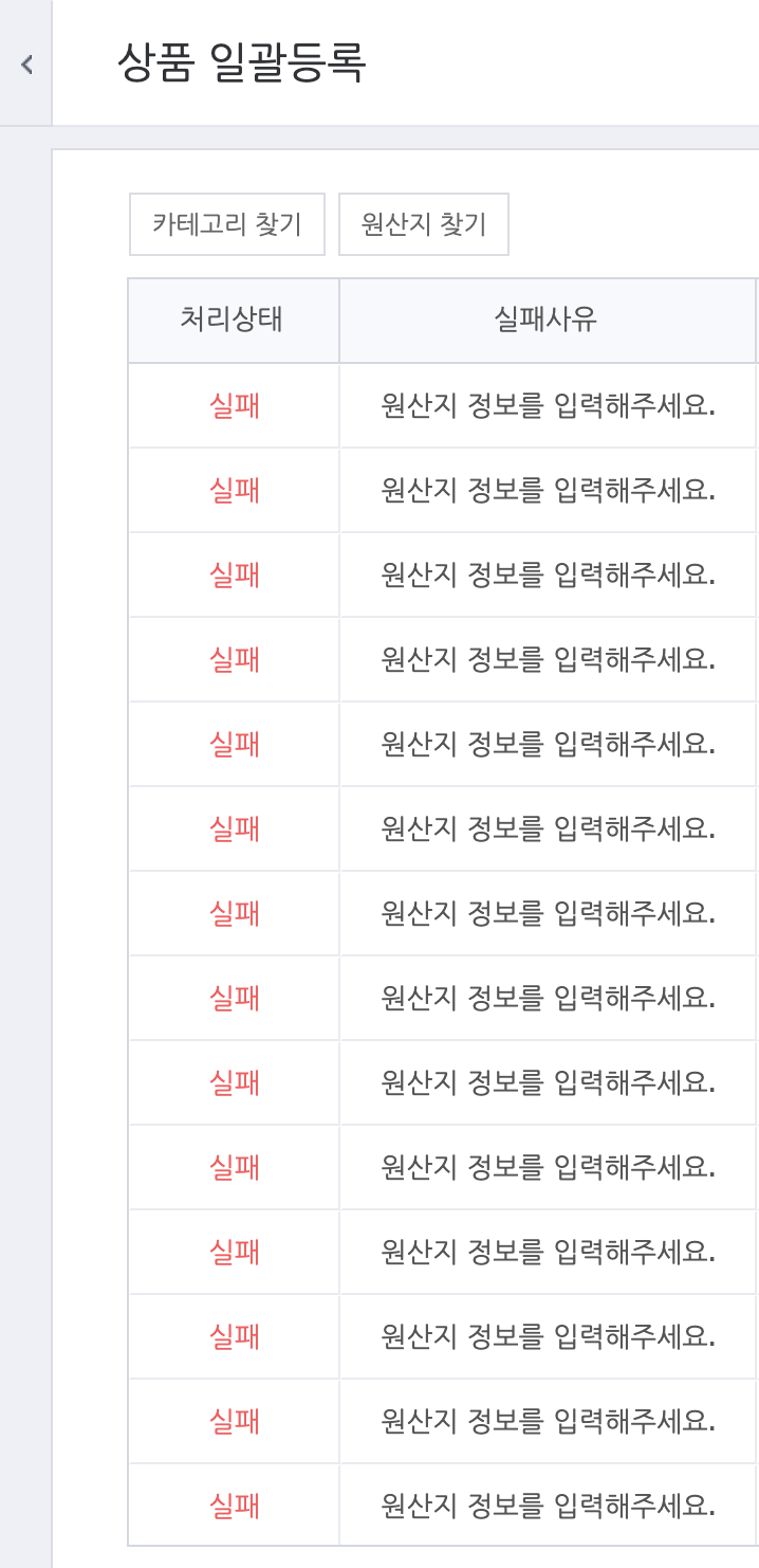 일괄등록 초반에 찾은 원산지 코드를 잘못 입력했다고 한다.