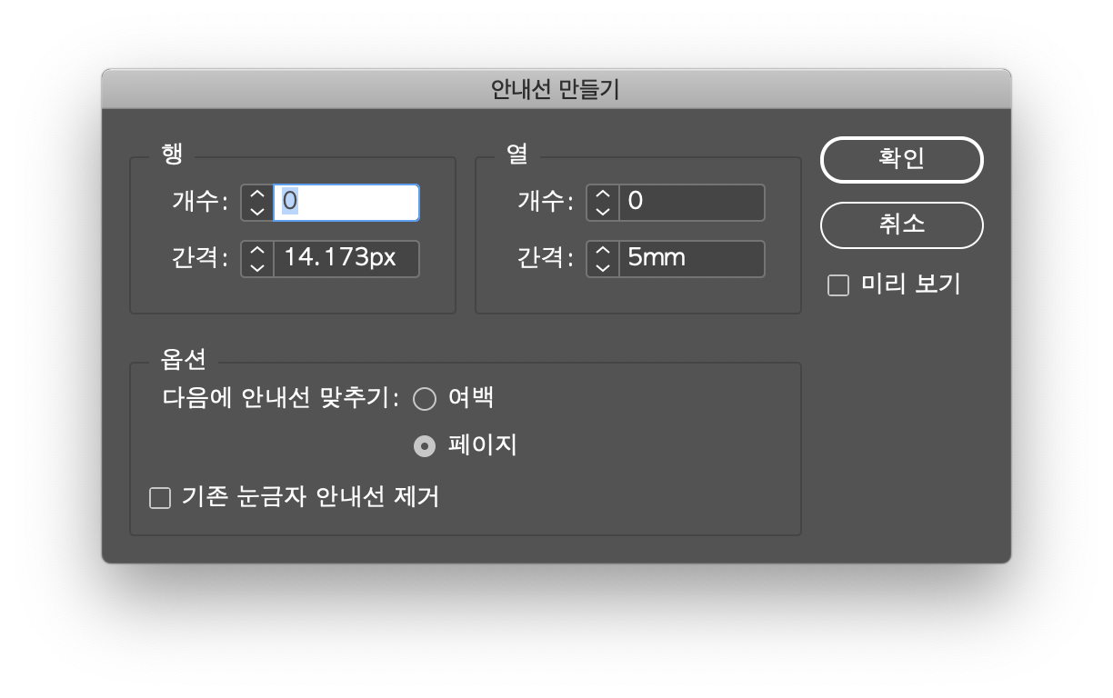 안내선 만들기 옵션으로 행과 열 모두 만들어도 상관없다.