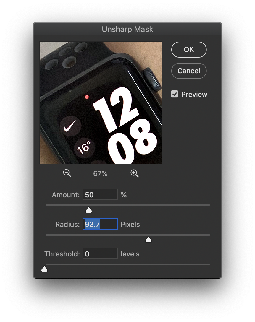 - 반경 슬라이더를 드래그하여 이미지 가장자리의 선명 효과 폭을 설정합니다.