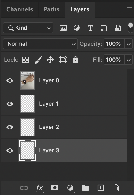 cmd키(ctrl)을 누른채 새로운 레이어버튼을 누르면 레이어가 아래쪽에 생긴다.(+네모 형태의 아이콘)