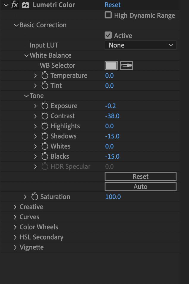 lumetri 설정값으로 노출과 대비, 색온도 등을 조정할 수 있다.