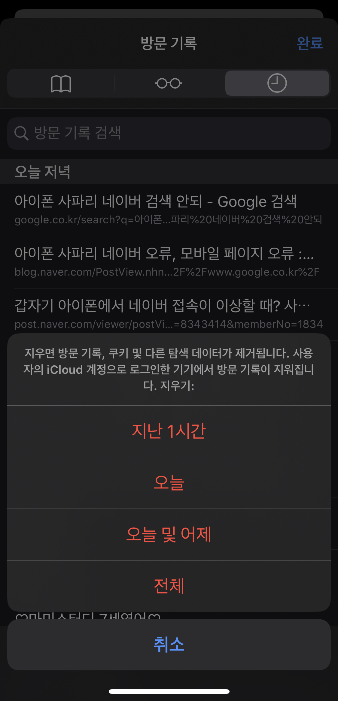 나는 '오늘 및 어제'로 선택해서 지워봤다.