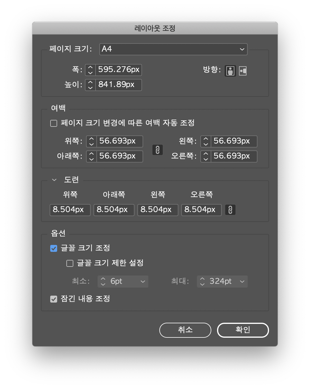 [문서설정] 패널에서 아래쪽에 있는 '레이아웃 조정'을 클릭하면