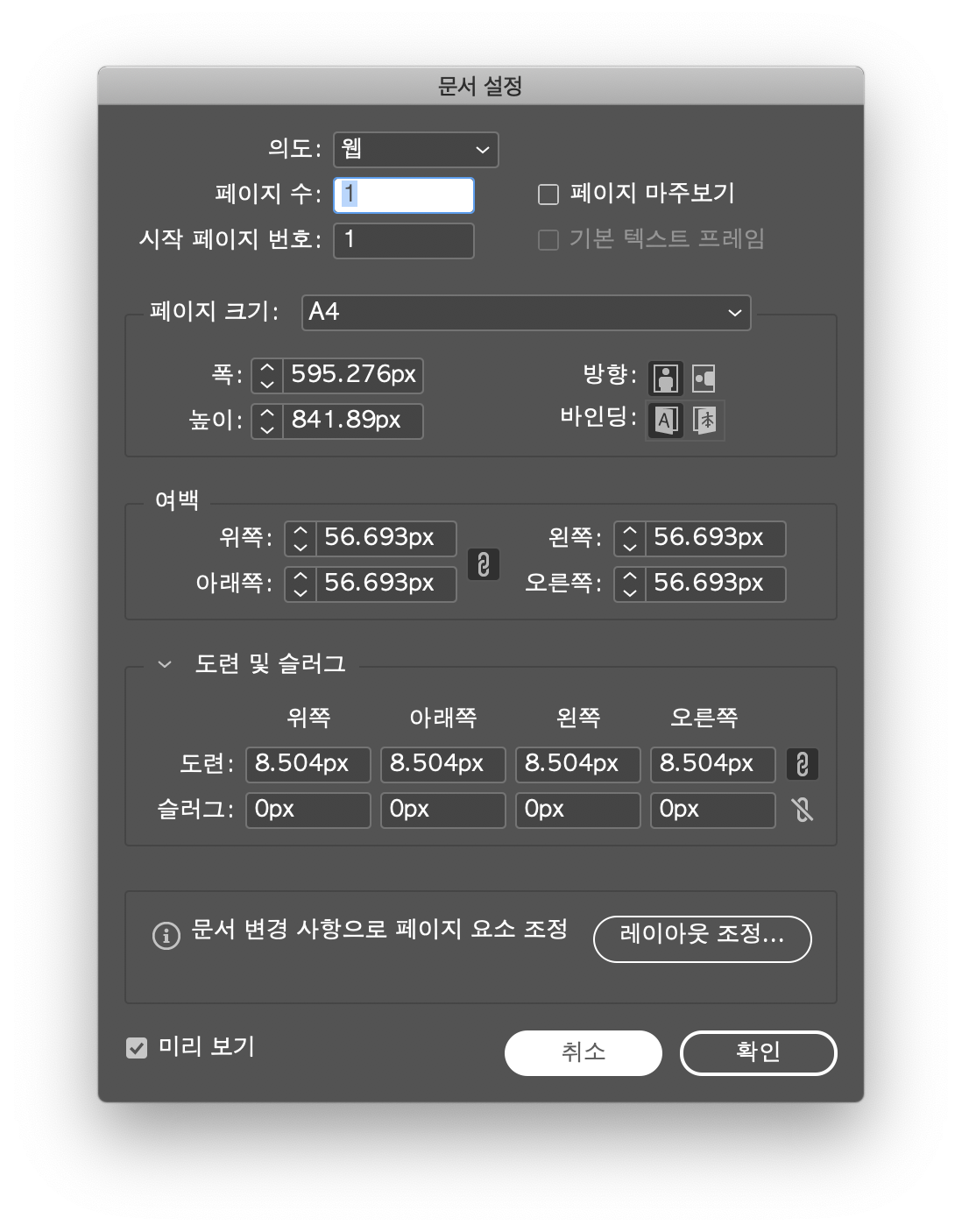 문서 설정에서 레이아웃 조정을 선택해도 되지만