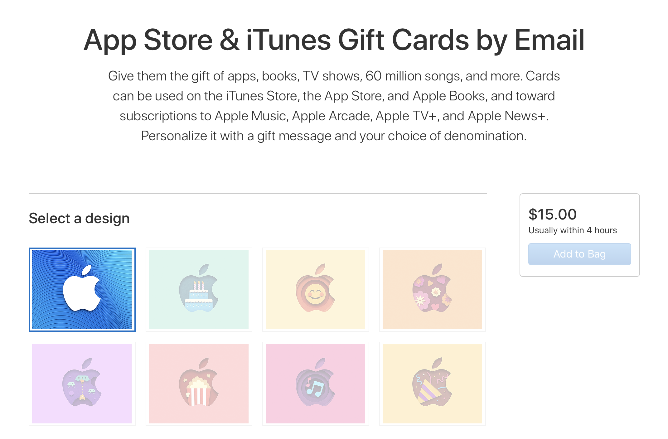미국 애플 기프트카드 페이지에서는 아이튠즈나 앱스토어에서 사용할 수 있는 카드를 우편이나 이메일로 발송하는 방법이 있고