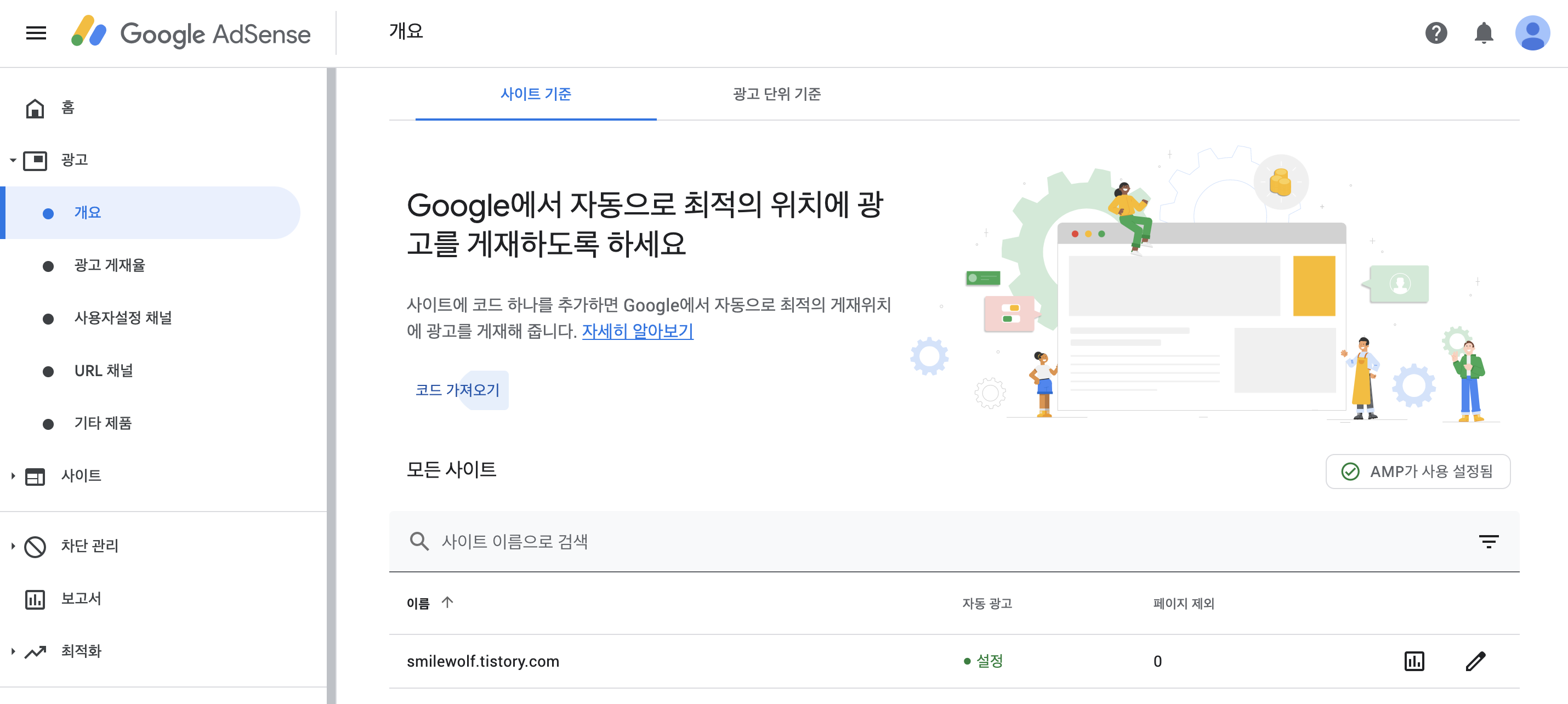 자동광고는 애드센스 페이지로 들어가서 [광고]-[개요]로 들어가면 코드가져오기가 보인다.