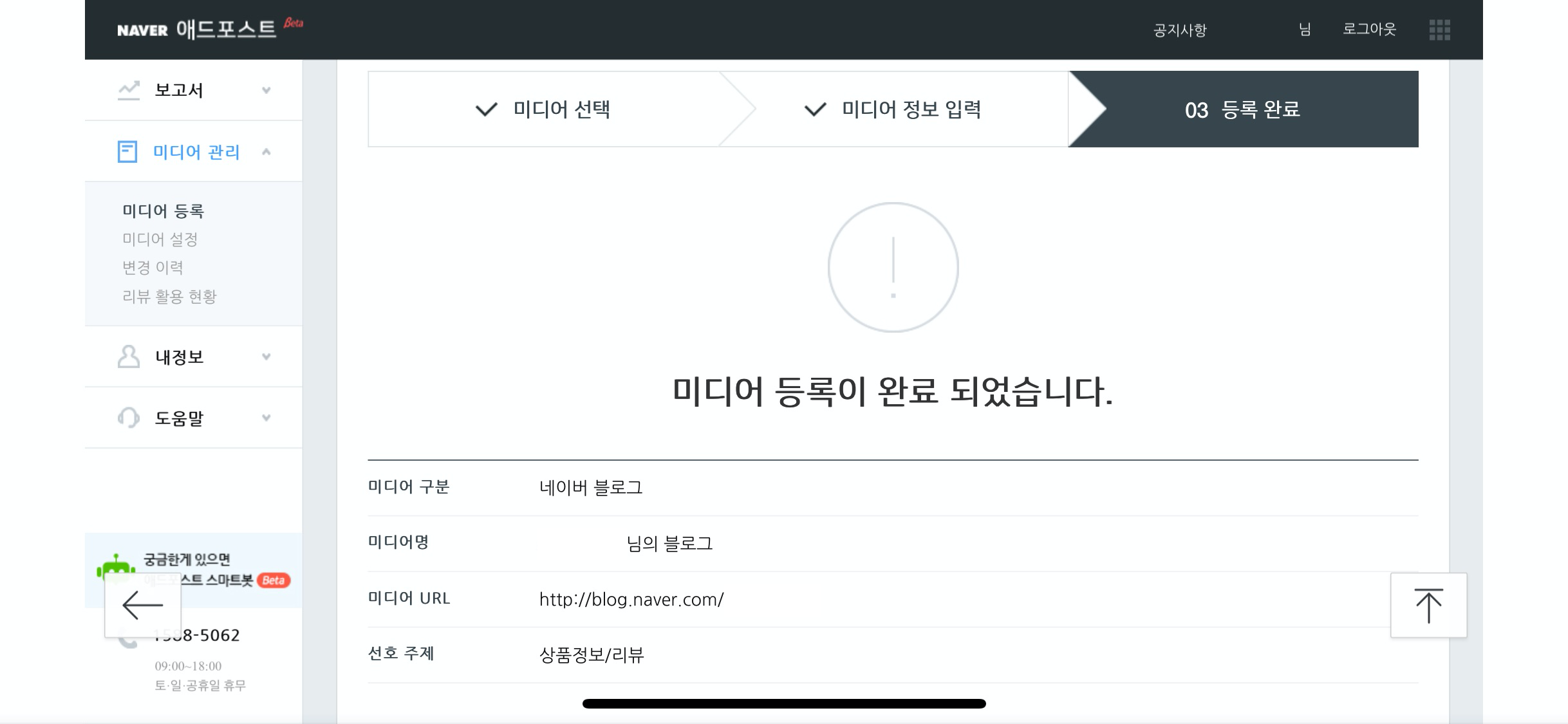그 블로그 주소를 클릭한 후 선호 주제를 선택한 후 확인을 하면 미디어 등록이 완료 되었습니다. 라고 뜨고 신청이 끝난다.