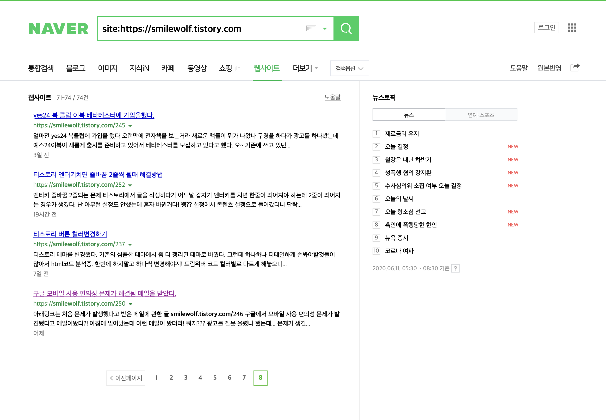 이런식으로 입력을 해서 네이버의 웹사이트 탭에서 확인을 하면 된다.