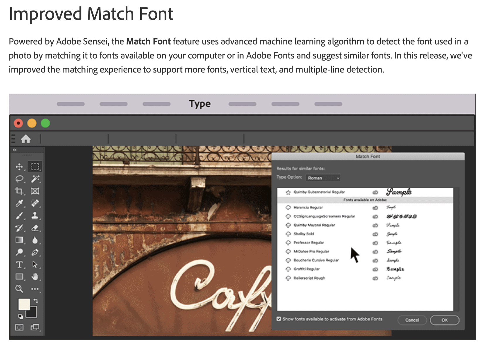 이미지를 불러와서 텍스트부분을 선택하면 그 서체와 비슷한 서체를 어도비 폰트 중에서 찾아준다.