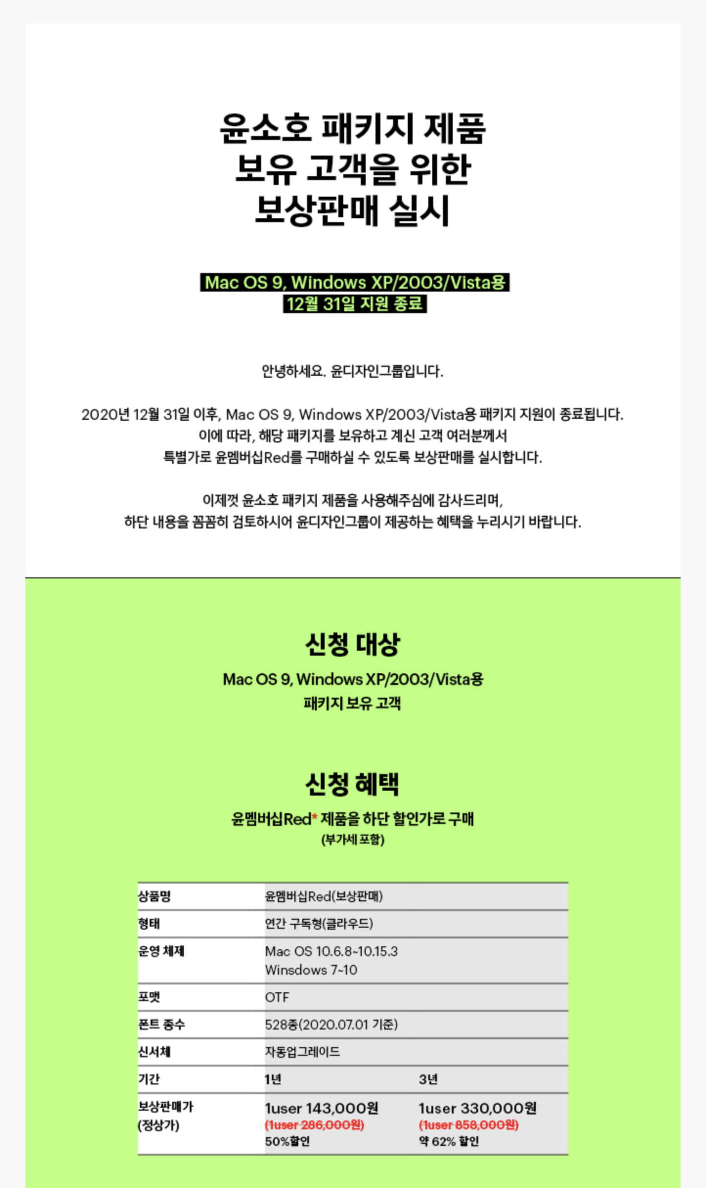 그때 판매했던 윤소호 패키지를 이제 올해가 끝나면 더이상 업데이트를 지원해주지 않는다고 한다.