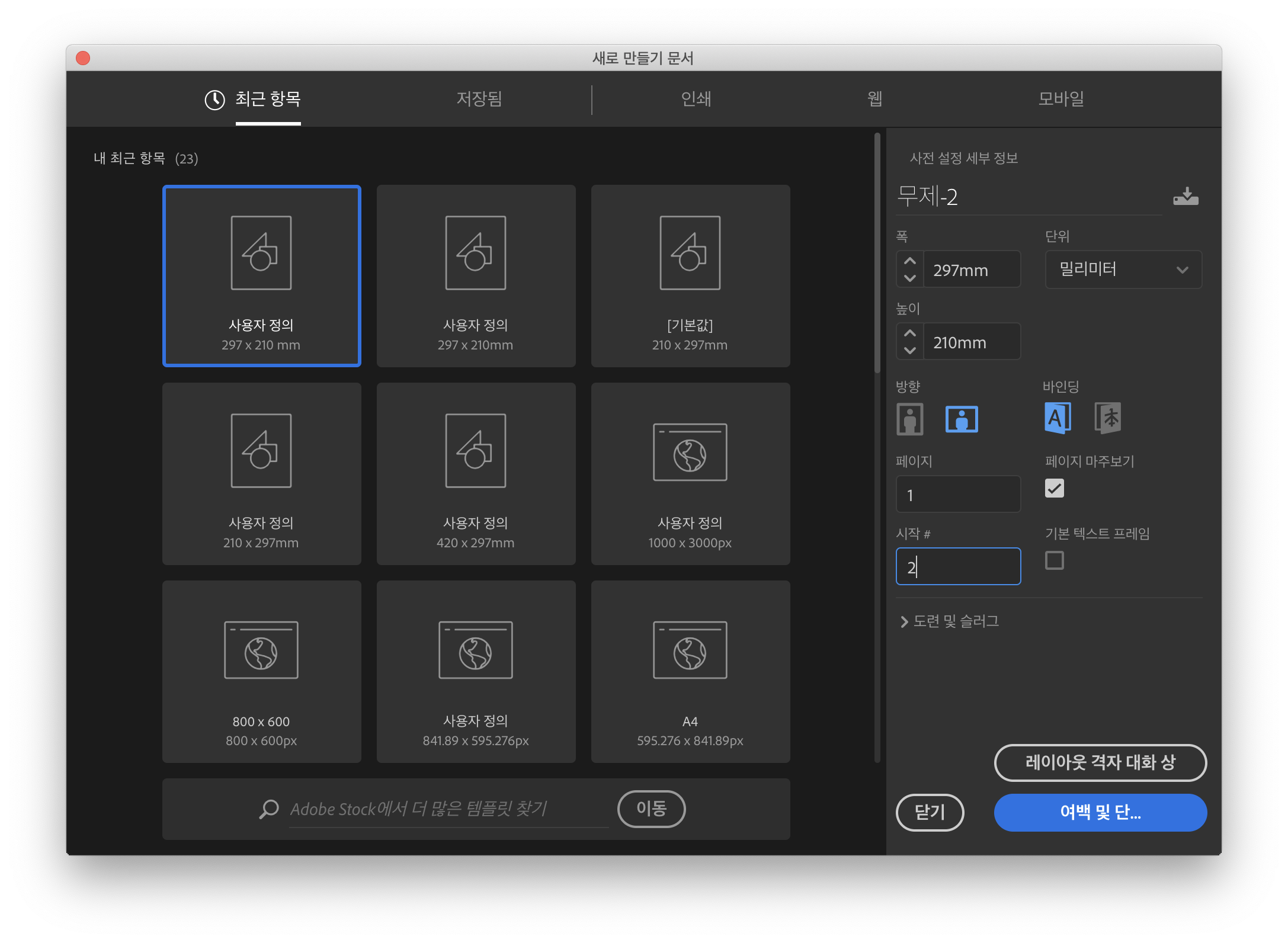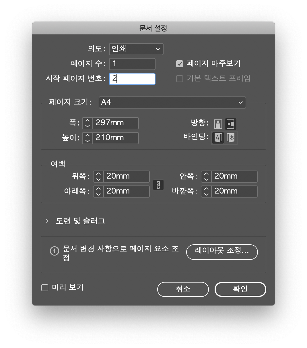 인디자인에서 새문서를 만들고 페이지 마주보기로 설정하면