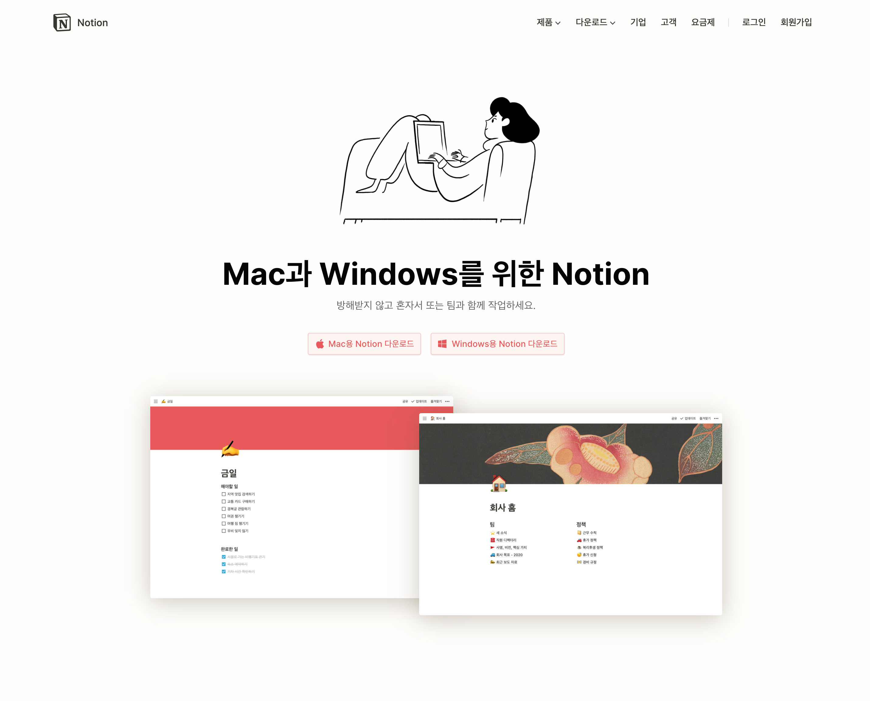 대체할 수 있는 제품으로 notion을 많이 이야기 하길래 다운받아서 사용 중이다.