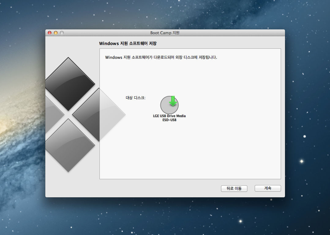 그리고 중간에 있는 'apple에서 최신 windows 지원 소프트웨어 다운로드'를 체크하고 '계속'버튼을 클릭한다.