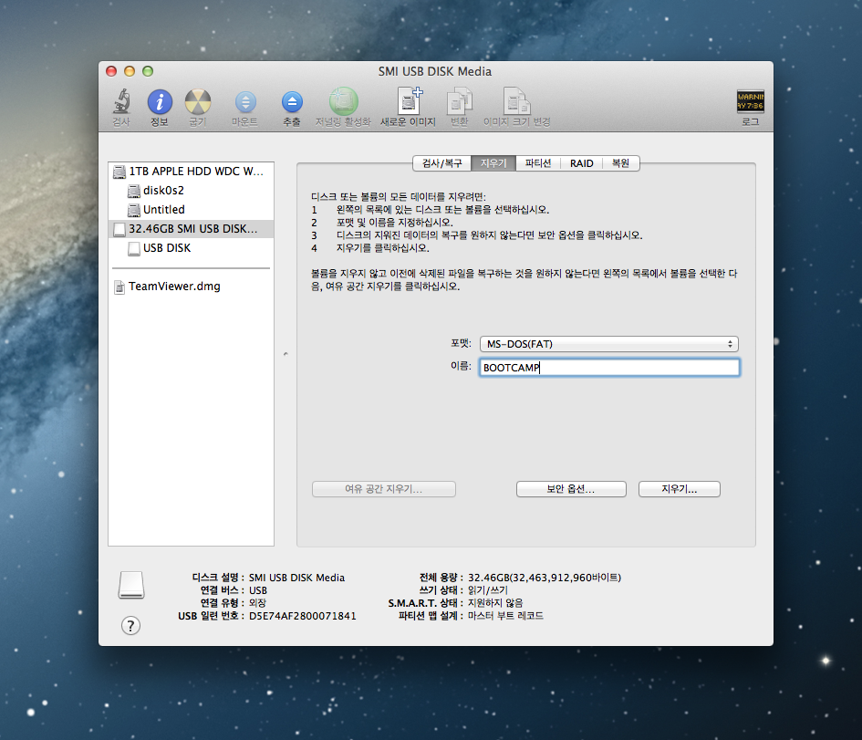 포멧 옵션을 MS-DOS(FAT)로 선택한 후 아래쪽에 있는 '지우기' 버튼을 클릭