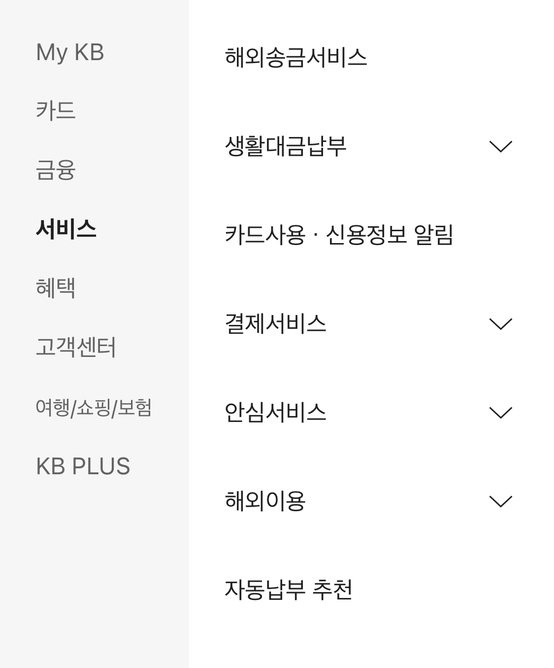 왼쪽에 '서비스'를 터치하고 오른쪽에 나오는 메뉴에