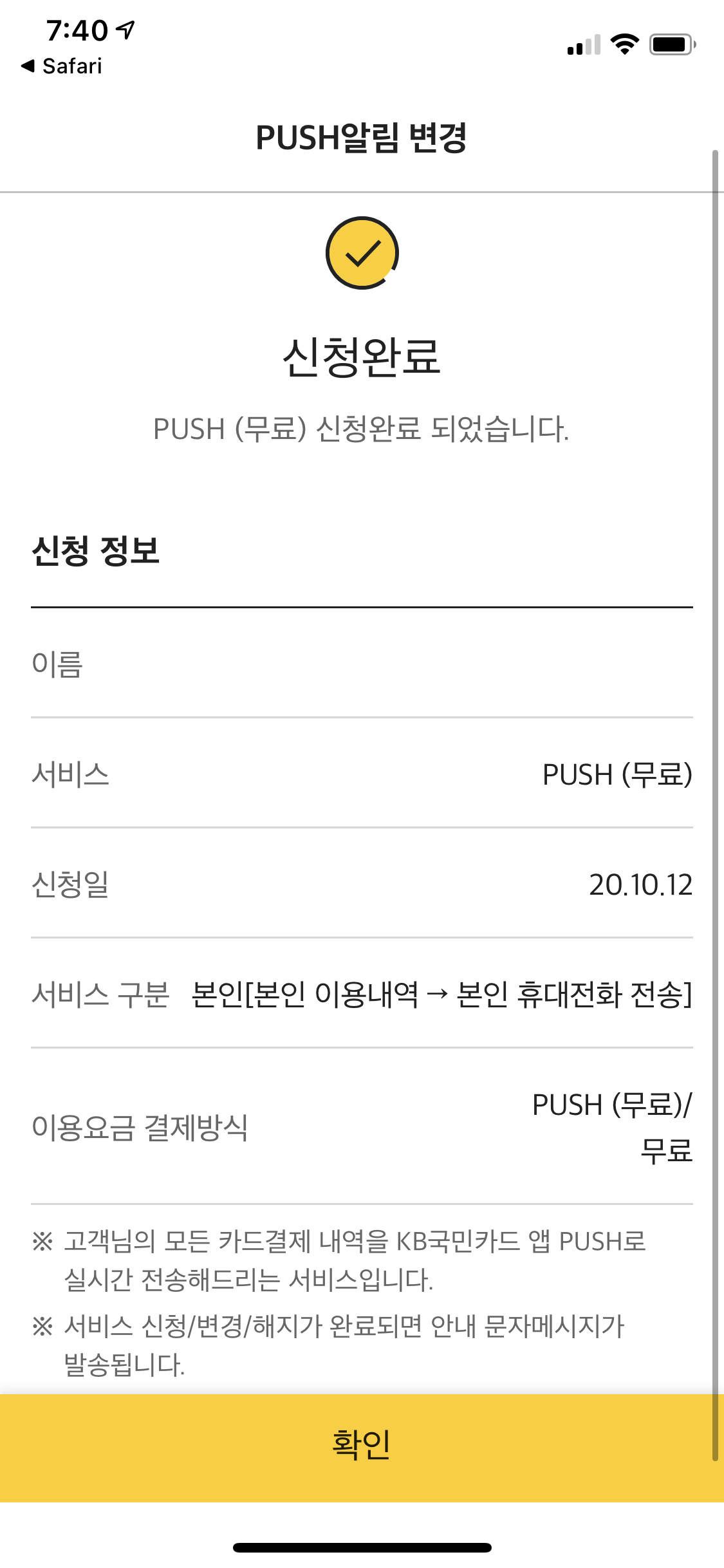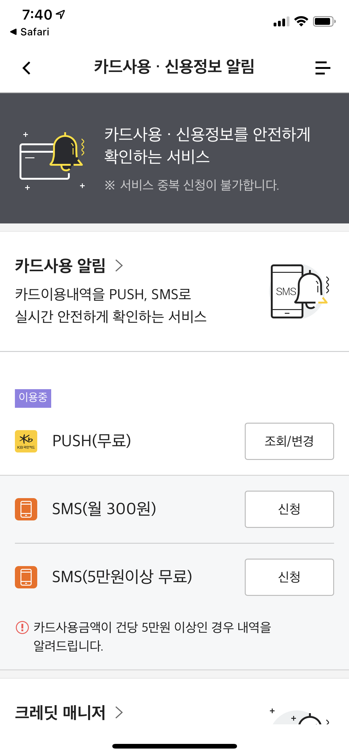 카드봉투 뒷면에 무료로 카드사용내역을 알람으로 받아볼 수 있는 PUSH알람 서비스가 있다고 해서 신청을 해봤다.