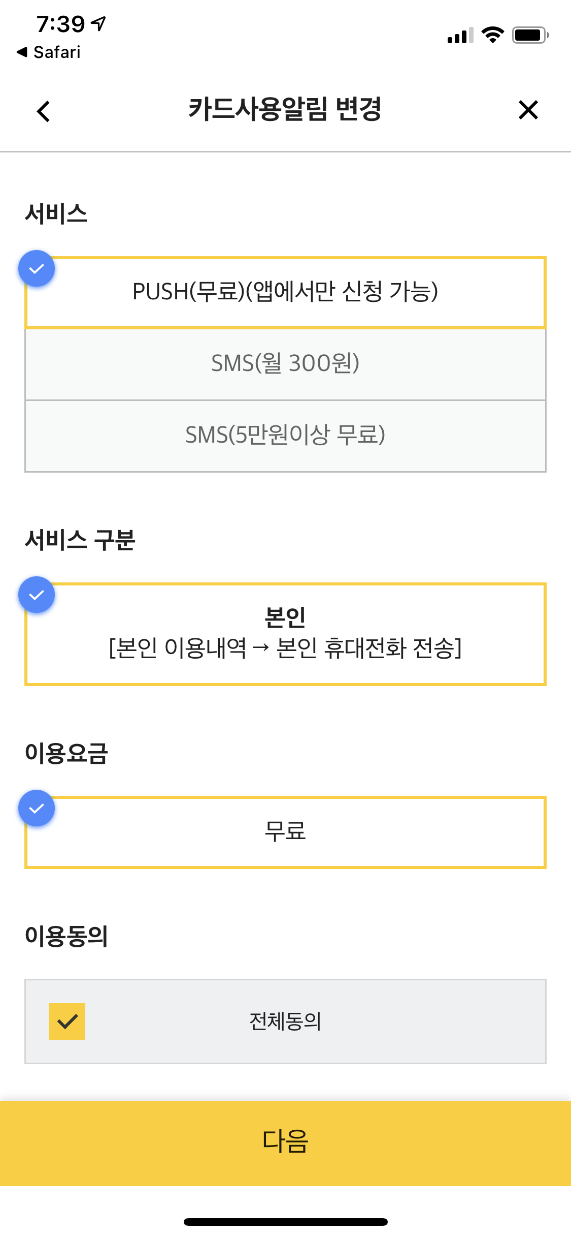'PUSH(무료)앱에서만 신청가능'을 선택을 하고
