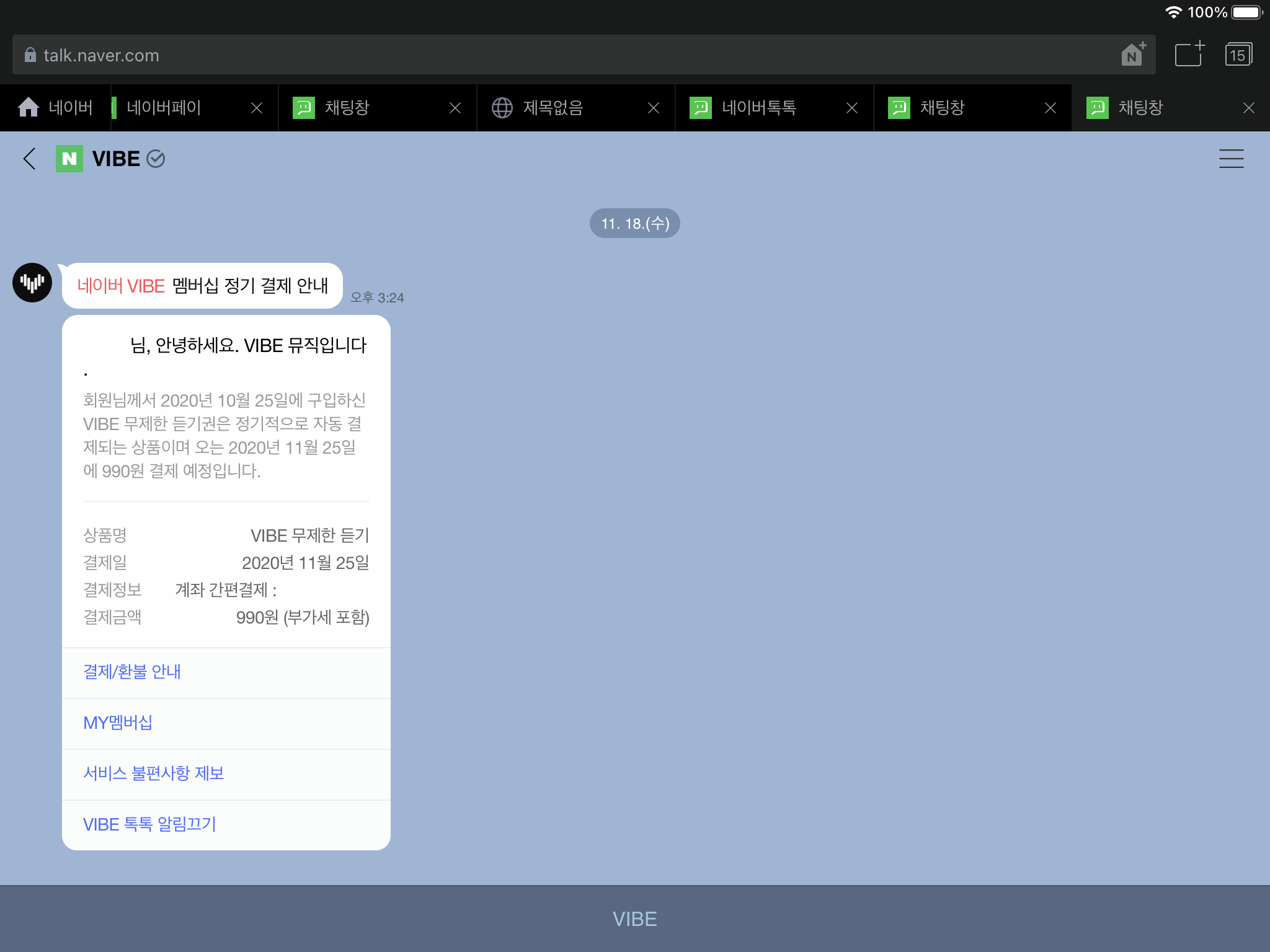 그런데 네이버 바이브는 언제 얼마가 결제될건지 이렇게 알람으로 알려준다.