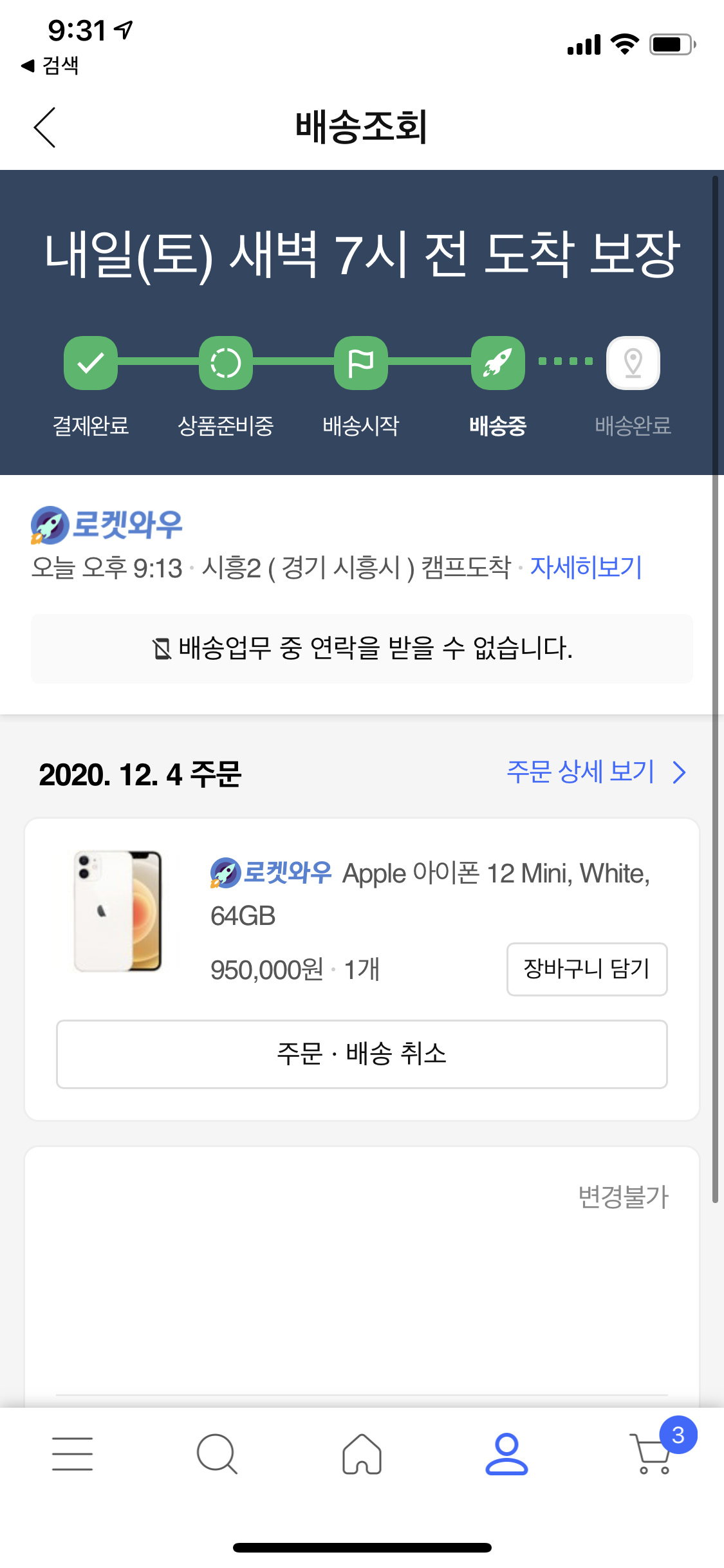 물건이 이천으로 이미 배송됐다고 표기(?)가 되어있어 바로 취소는 안되고