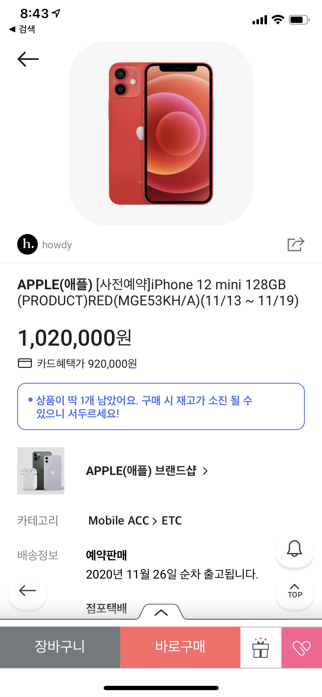하는 순간 아이폰12 미니 레드 64기가 제품이 뜨길래