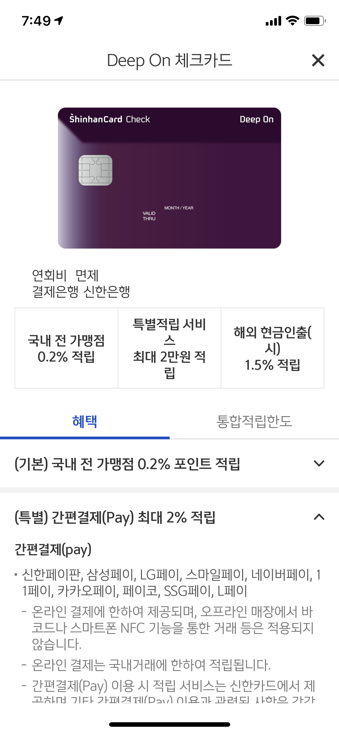 찾아보니 신한 체크카드 deep on 이라는 카드가 있는데
