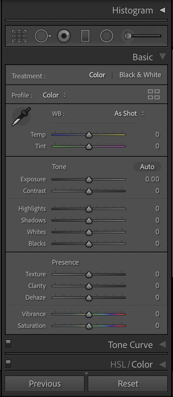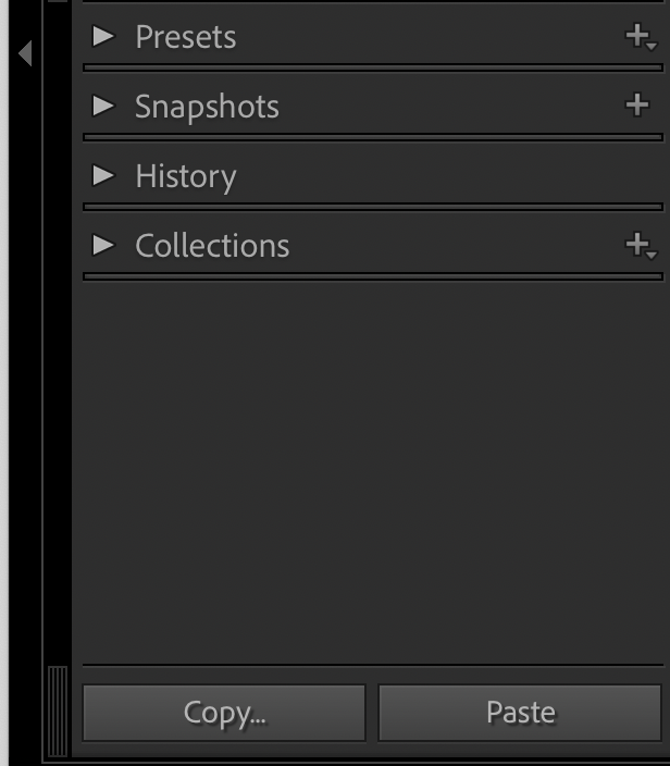 quick develop 패널 바로 아래에 있는 saved preset 버튼을 클릭한다.