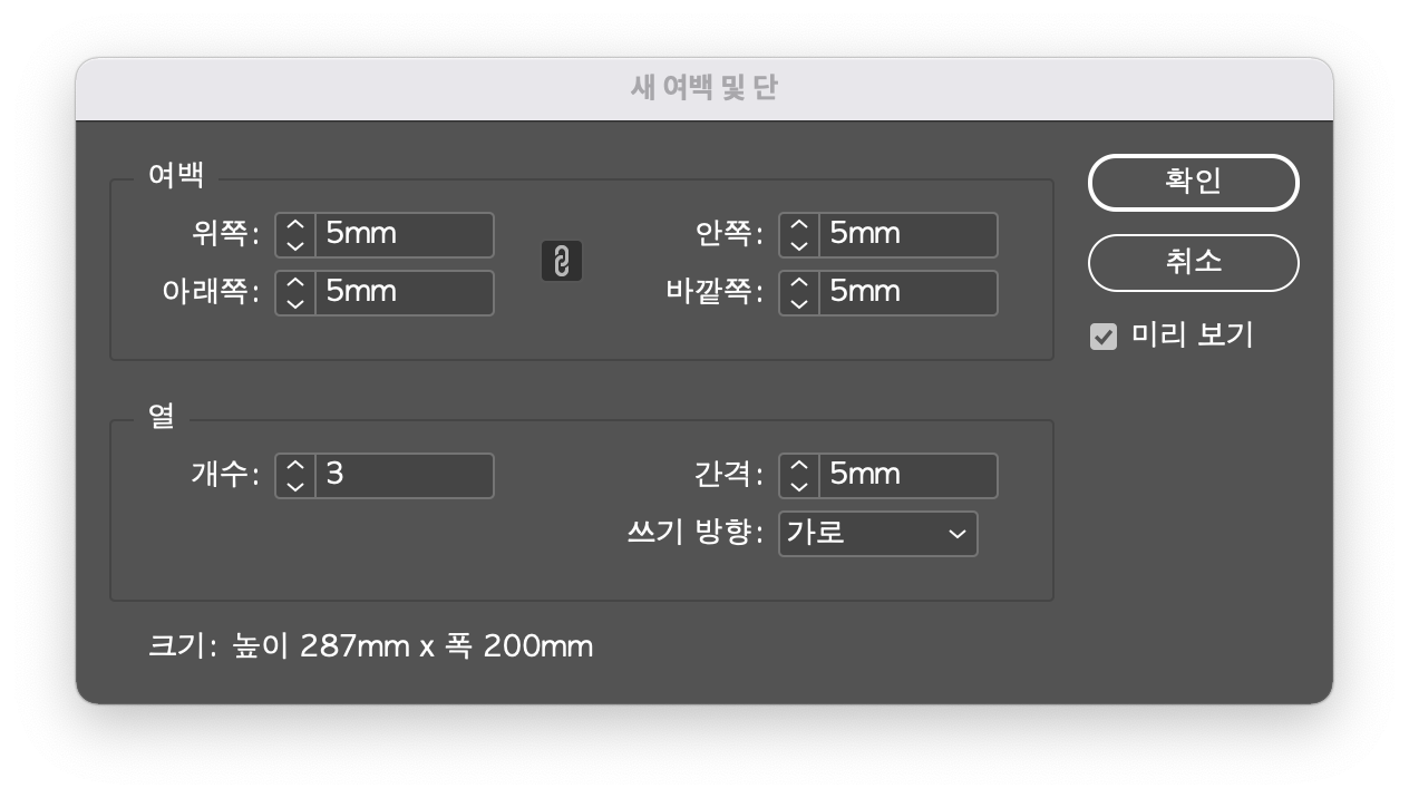 새문서를 만들때 열의 갯수가 5개로 나오고 간격이 3mm 로 설정된 값이 기본으로 표시되어 나온다.
