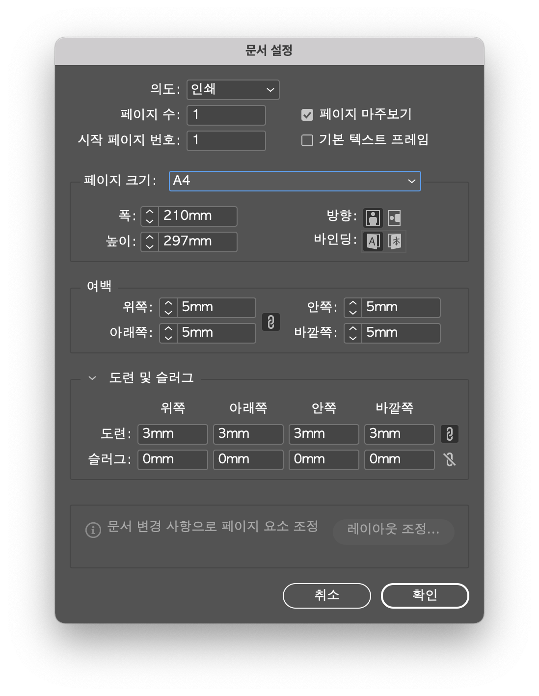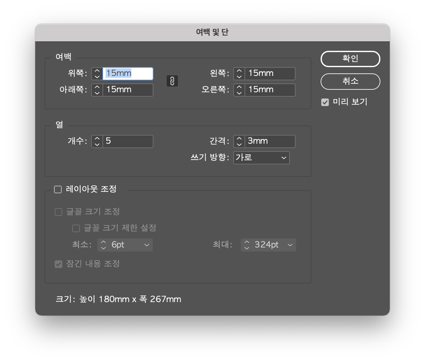 [여백 및 단]에서 나오는 여백은 아까 위에서 적용한 [문서 설정]보다 우선하지 않는다.