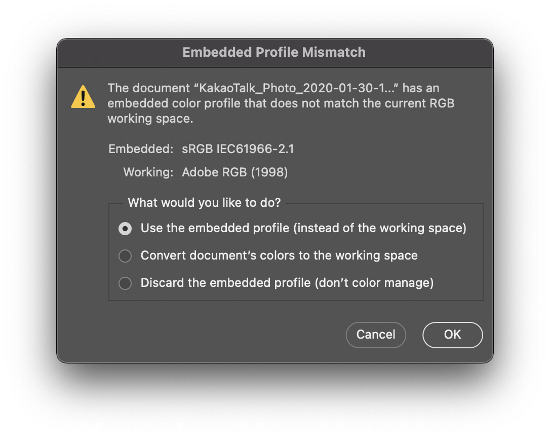 마지막은 그냥 컬러값 무시하고 가져올것인지 (이걸 선택하면 untagged RGB로 표기 된다.)