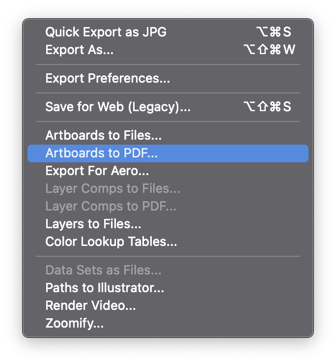 [file]-[export]-[artboards to PDF] 또는 [artboards to Files]를 선택하면 된다.