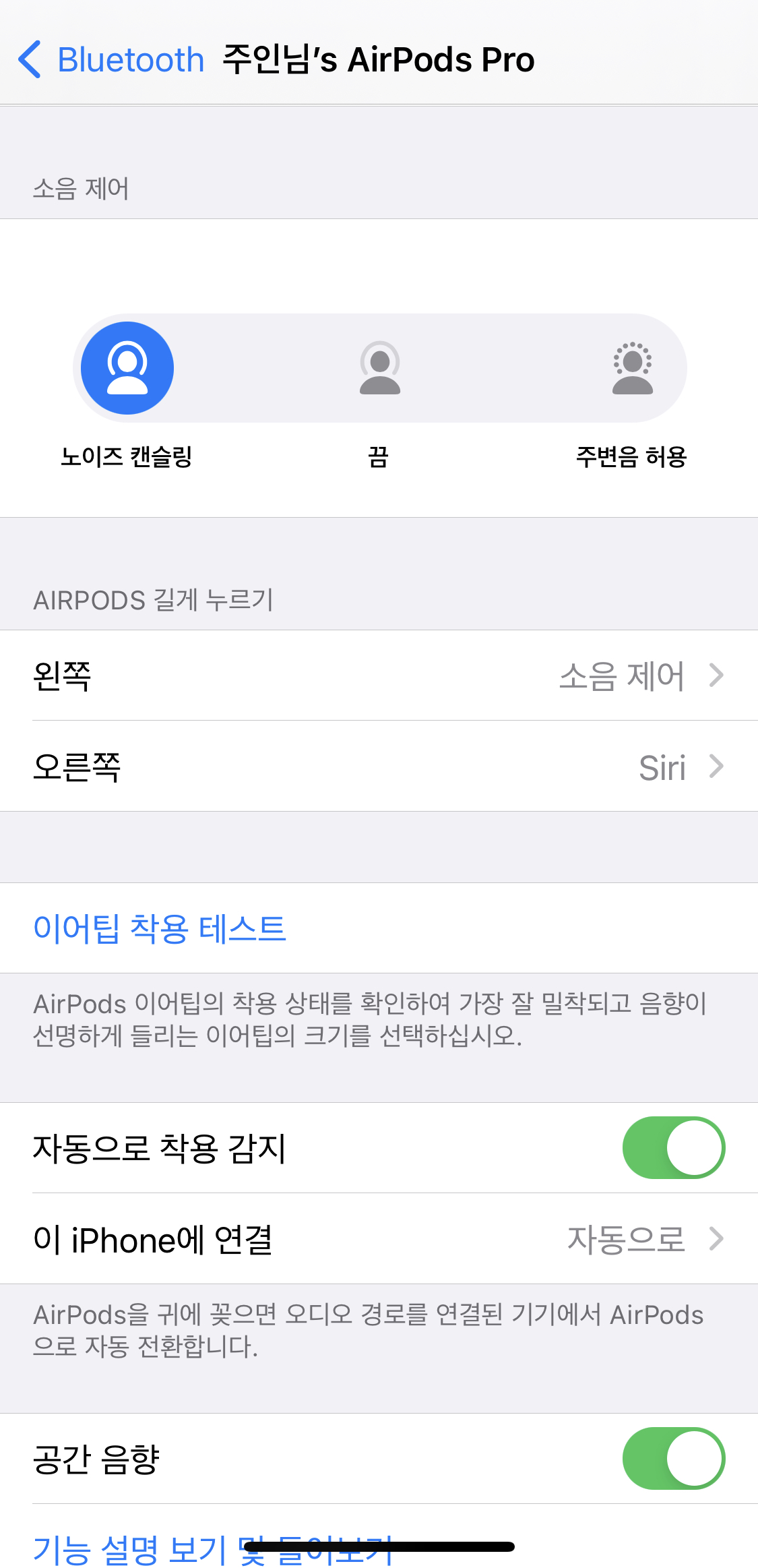 그리고 에어팟 프로에서는 설정할 수 있는 옵션들이 정말 더 많은것 같은 느낌이 들더라.