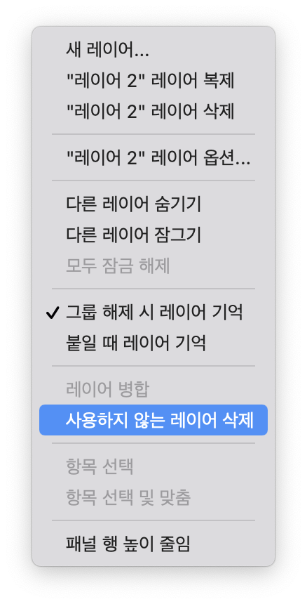 레이어패널에도 컬러패널처럼 사용하지 않는 레이어를 삭제하는 기능이 있더라!