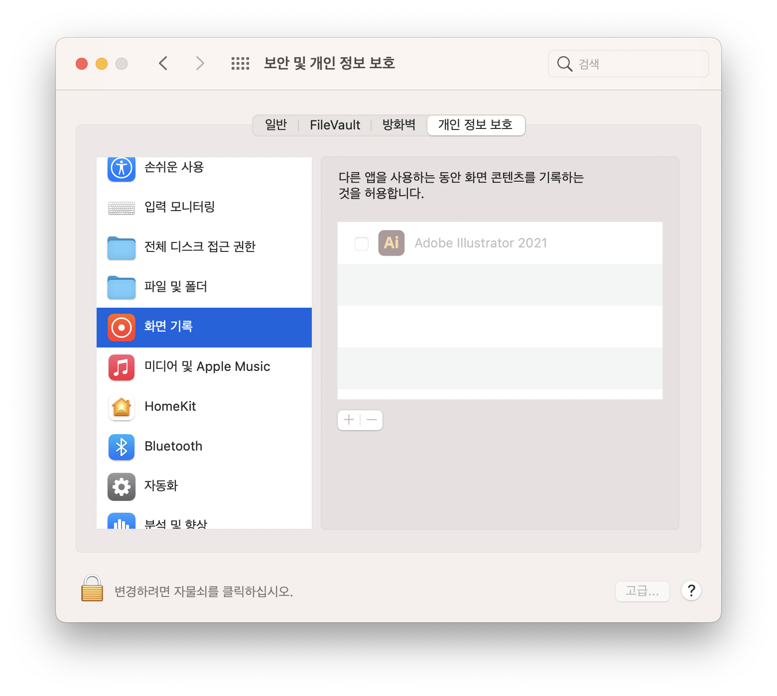 애플 환경설정으로 들어가서 [보안 및 개인 정보 보호]를 클릭하면