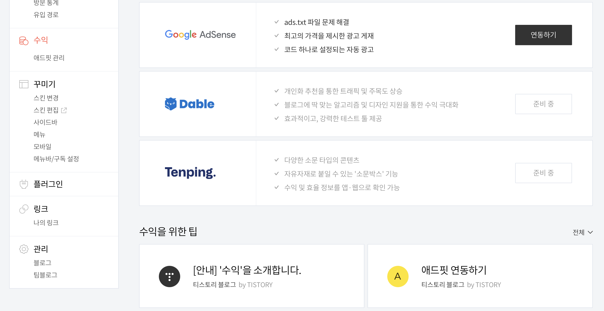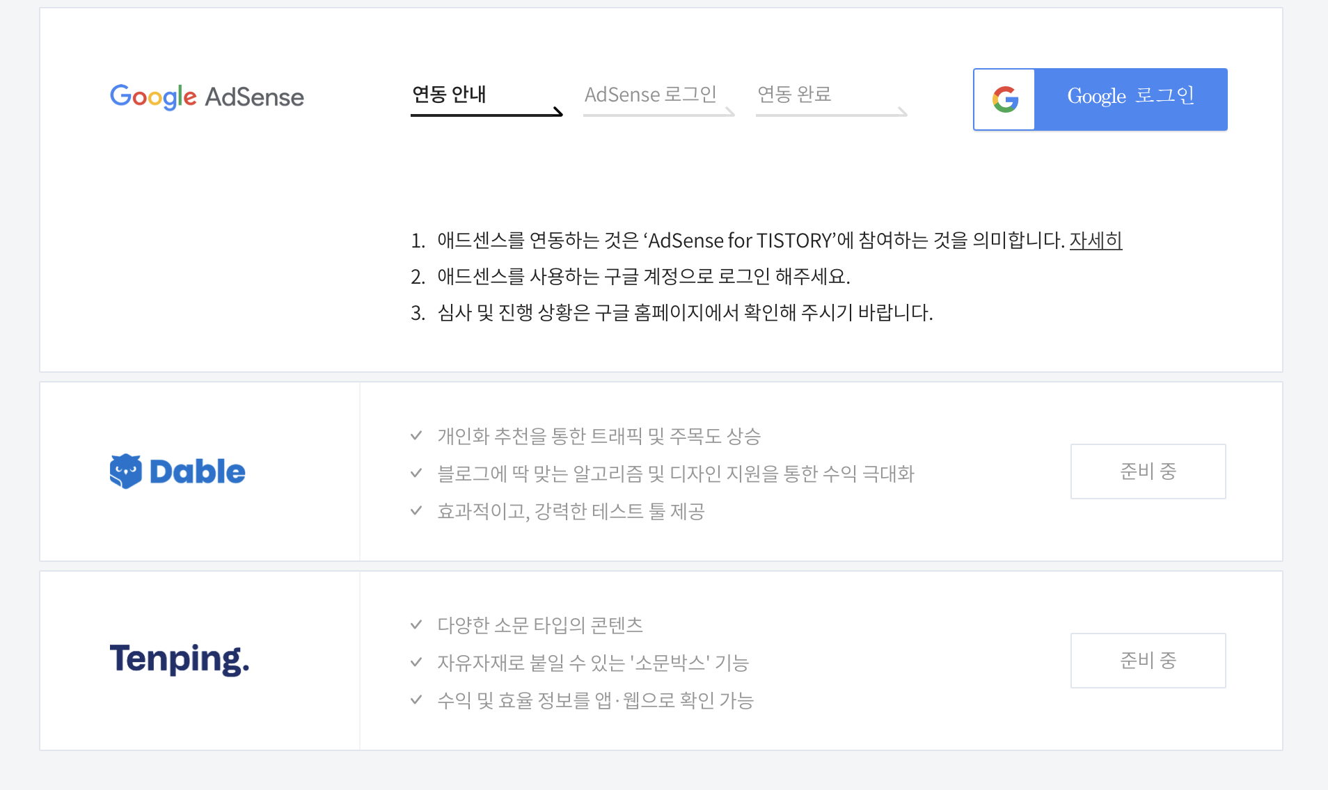 그리고 여기서 발견한게 dable과 tenping 인데 이것도 조만간 티스토리에서 연동을 해서 관리할 수 있게 해주나 보다.