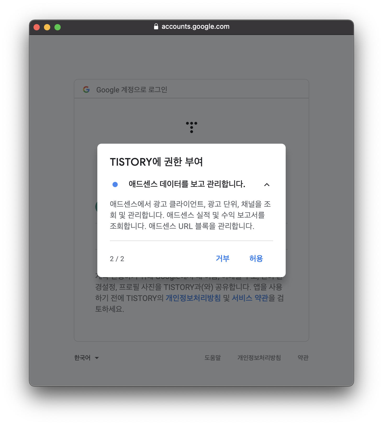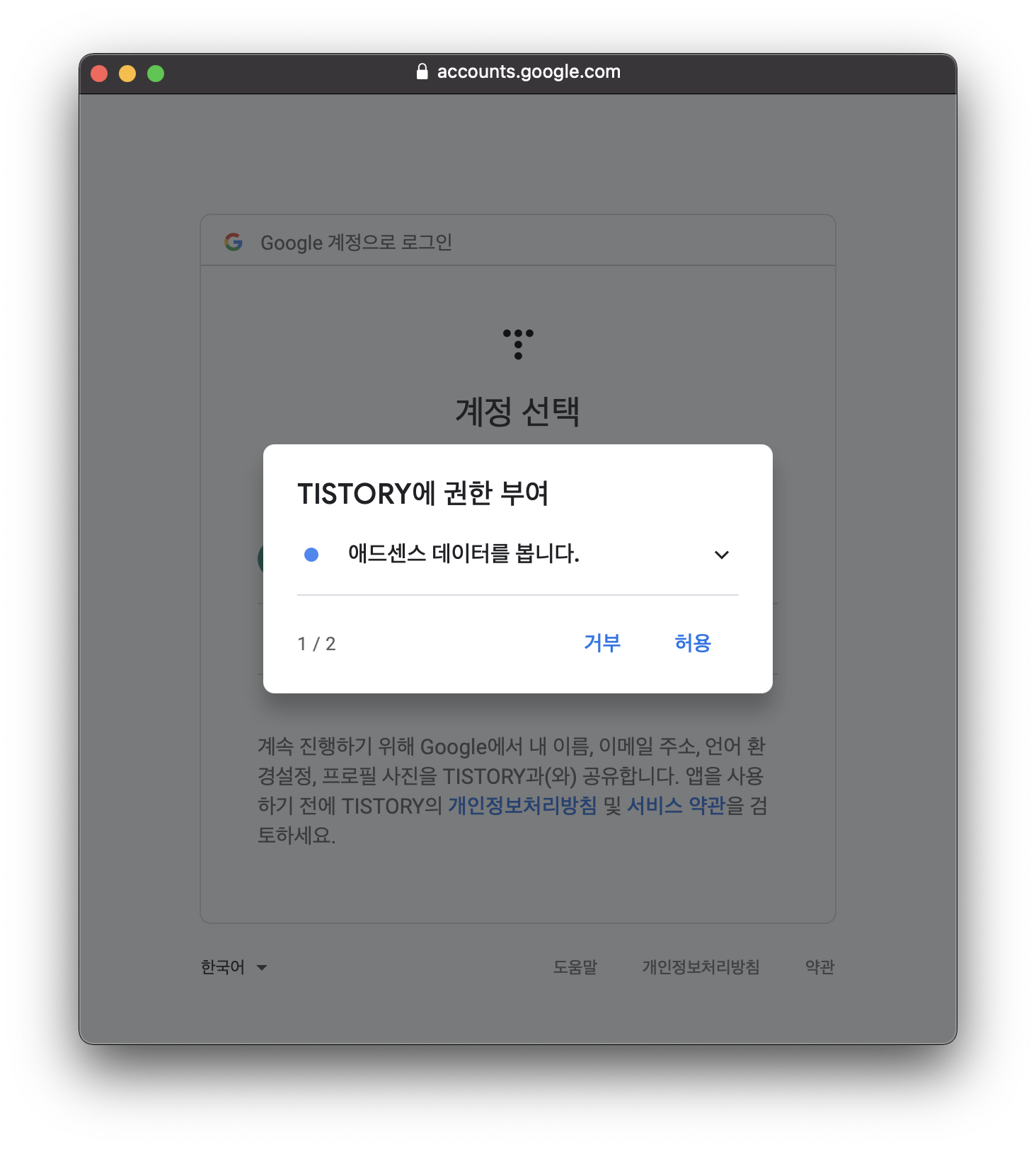 구글 계정으로 로그인하면 티스토리 권한부여를 선택할 수있는 창이 나오는데