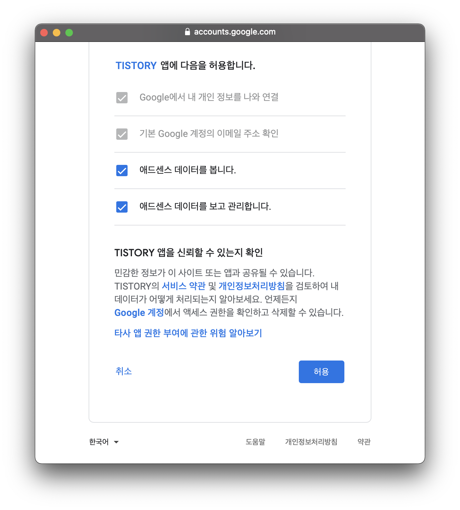 이걸 해줘야 티스토리 관리계정에서 정보를 볼 수 있을것 같아서 허용을 했다.