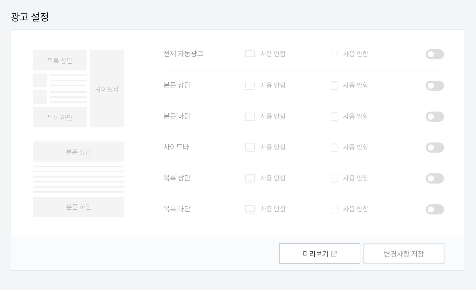 그리고 또 광고설정을 여기서 쉽게 할 수있다. 우측 토글버튼을 클릭만 하면 활성화 되면서 광고설정을 켜고 끌수있다.