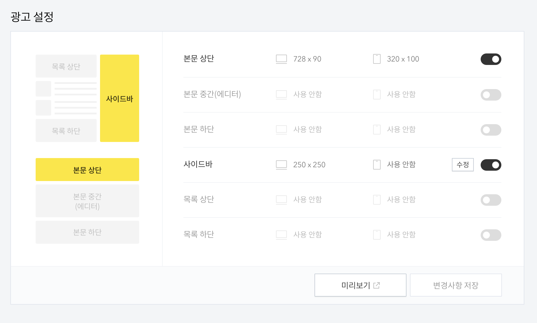 애드핏 광고는 수익이 정말 미비한데.. 따로 관리을 안했던 것도 있고 지금 자세히 보니까 본문상단과 사이드바가 설정되있었네