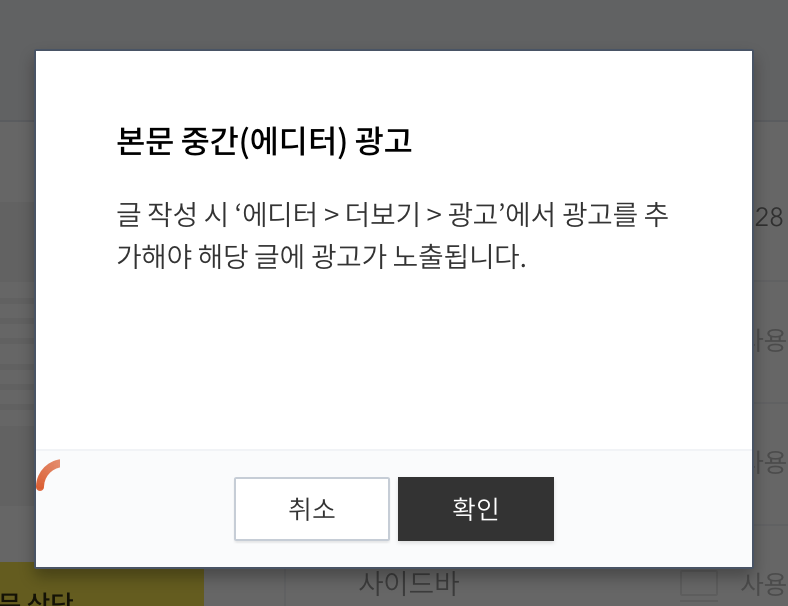 본문 중간(에디터)광고를 설정을 했더니 이런 팝업창이 떴다. 본문 중간 광고는 네이버처럼 자동으로 붙는게 아니라 에디터> 더보기> 광고 에서 광고를 추가해야 해당 글에 광고가 노출된다고 한다.