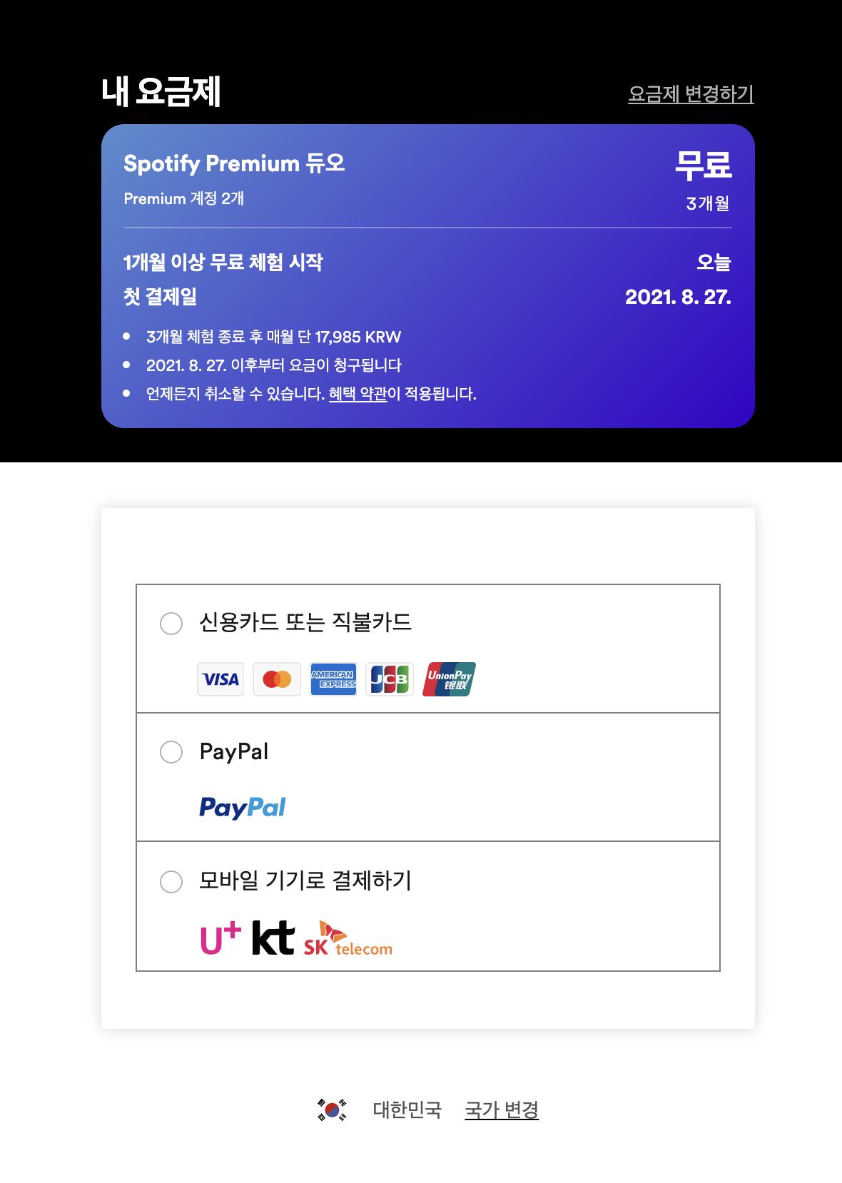어쨌든 다시 진행을 하니 무료로 spotify premium duo에 가입을 했다.