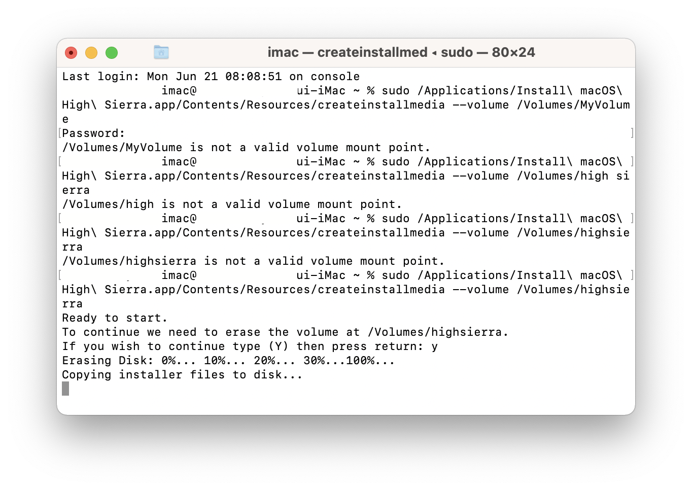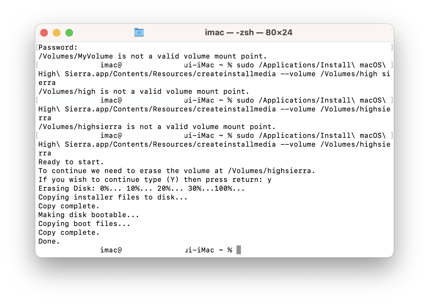 sudo /Applications/Install\ macOS\ High\ Sierra.app/Contents/Resources/createinstallmedia --volume /Volumes/MyVolume