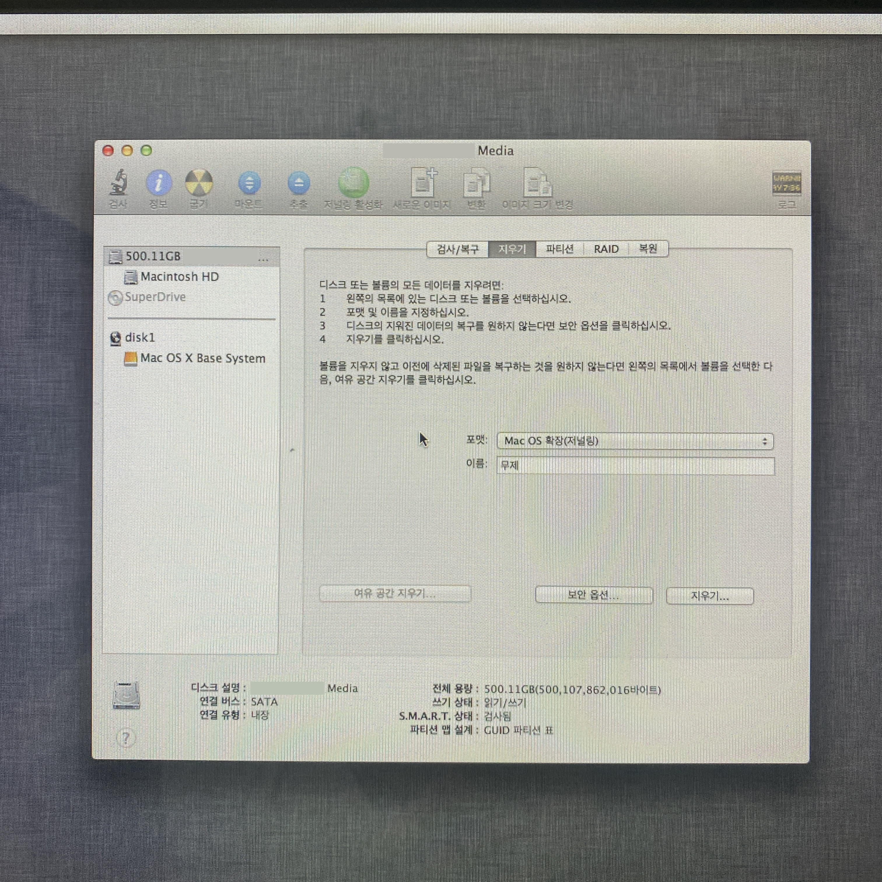 디스크 유틸리티에서 맥에 셋팅된 HDD를 Mac OS 확장(저널링)으로 지우면 된다.
