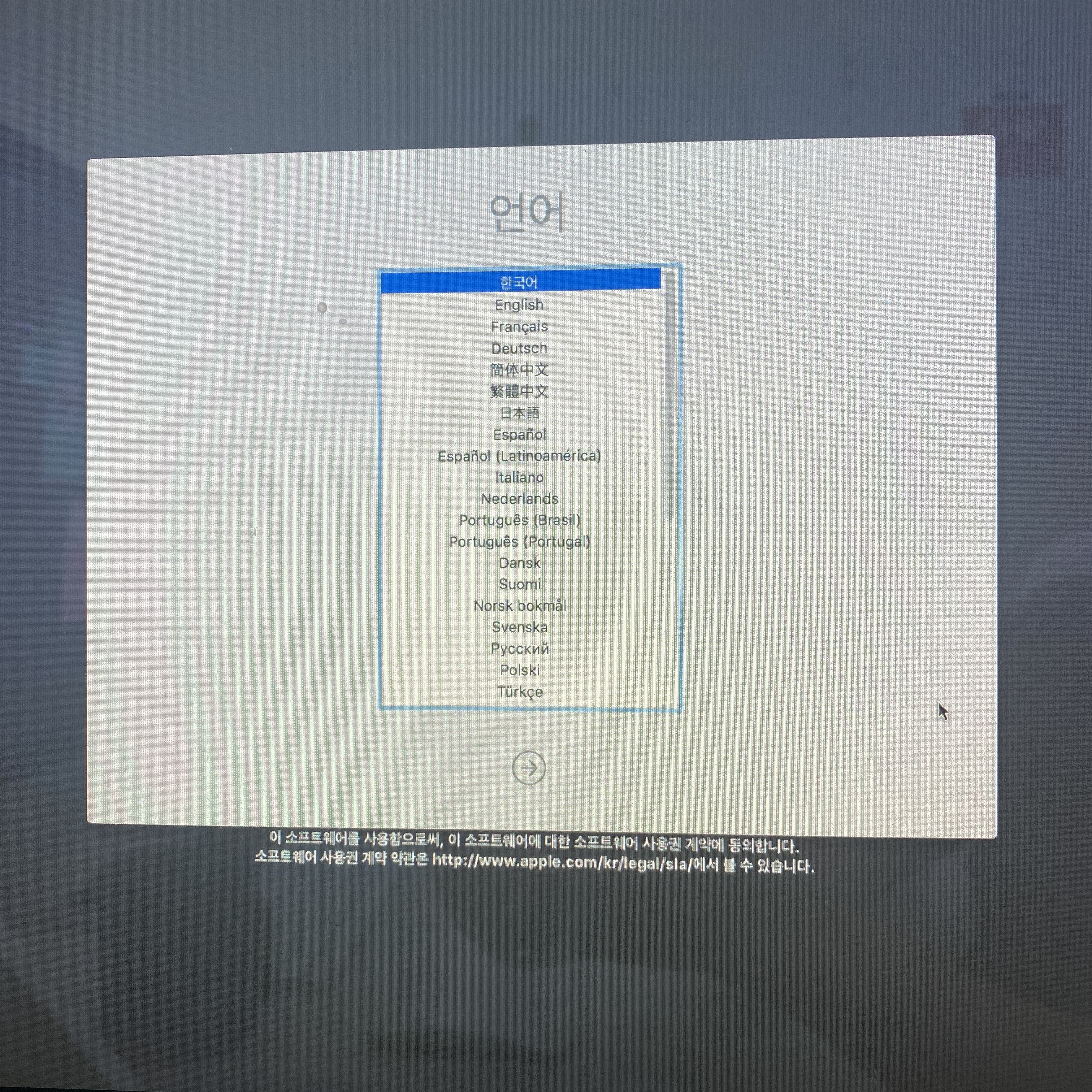 초기 셋팅과정에서 강제 종료 버튼을 눌러 아이맥을 껐다.