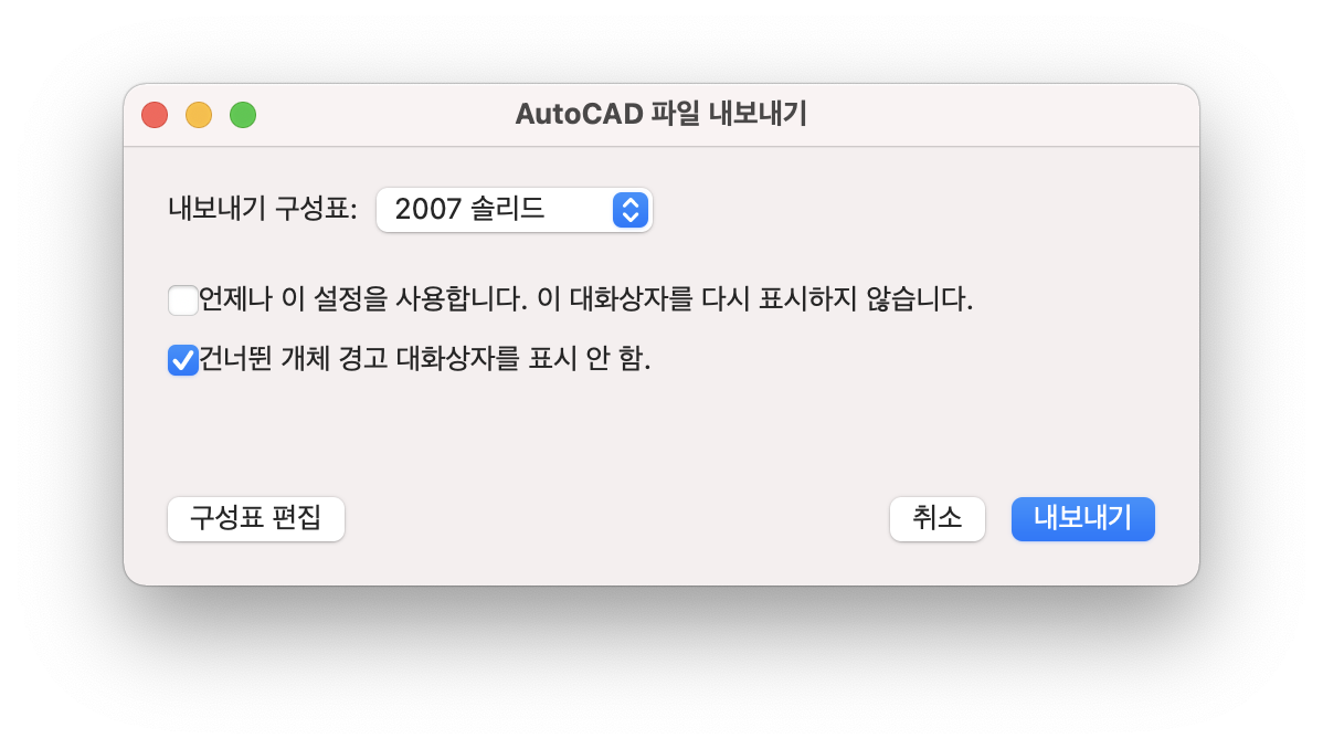 그리고 최종 내보내기 옵션은 2007 솔리드로 선택했다.
