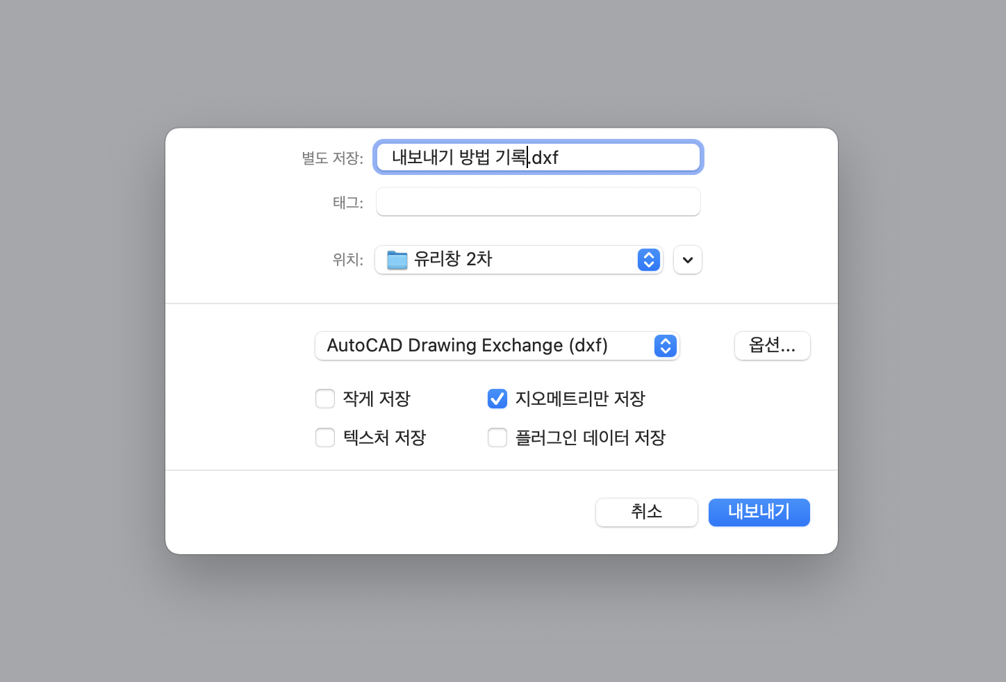 파일을 내보내기 할때 저장파일은 확장자명은 dxf 로 한다.