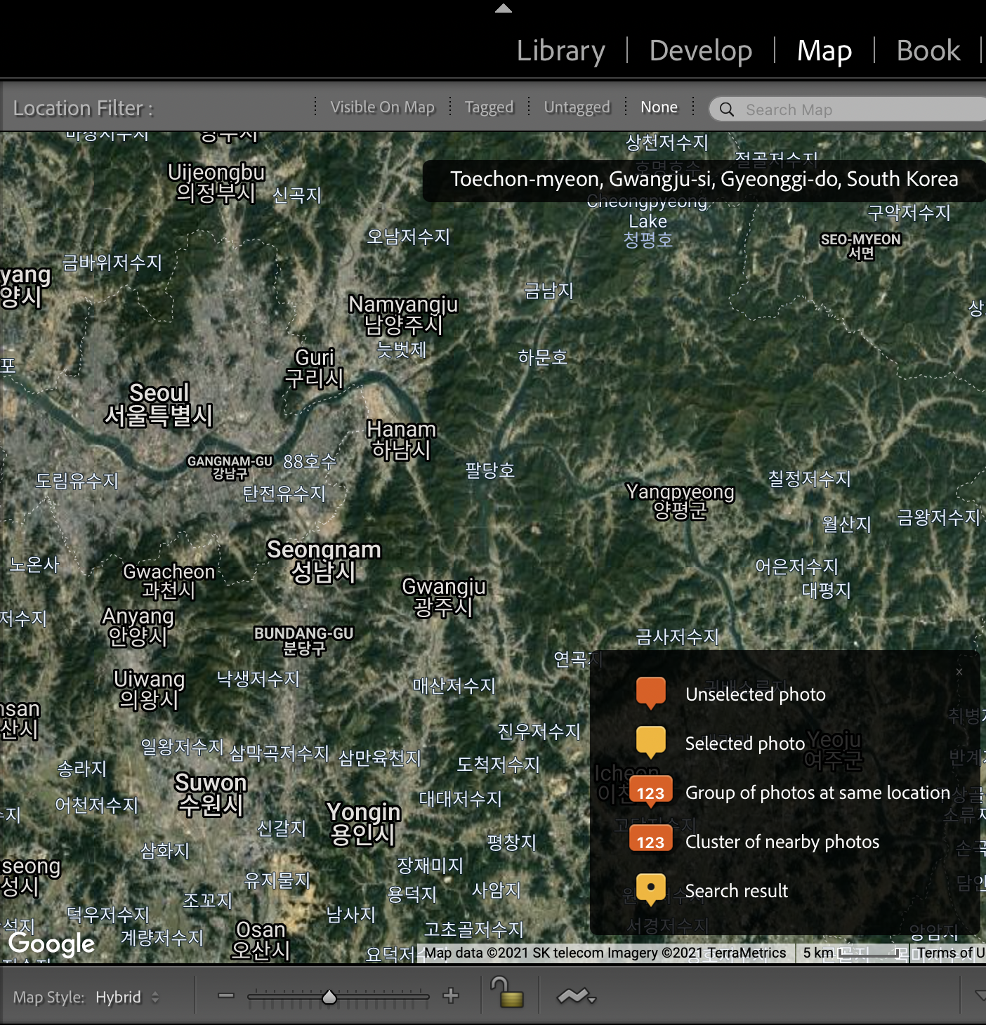 라이트룸 상단의 MAP 탭을 클릭하면 사진을 찍은 장소가
