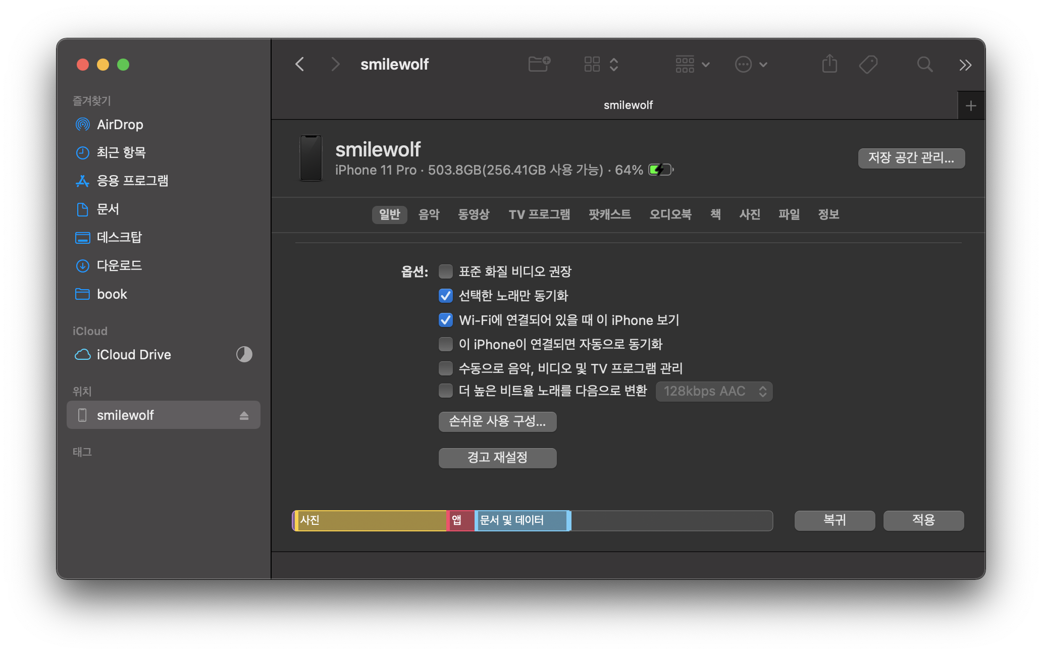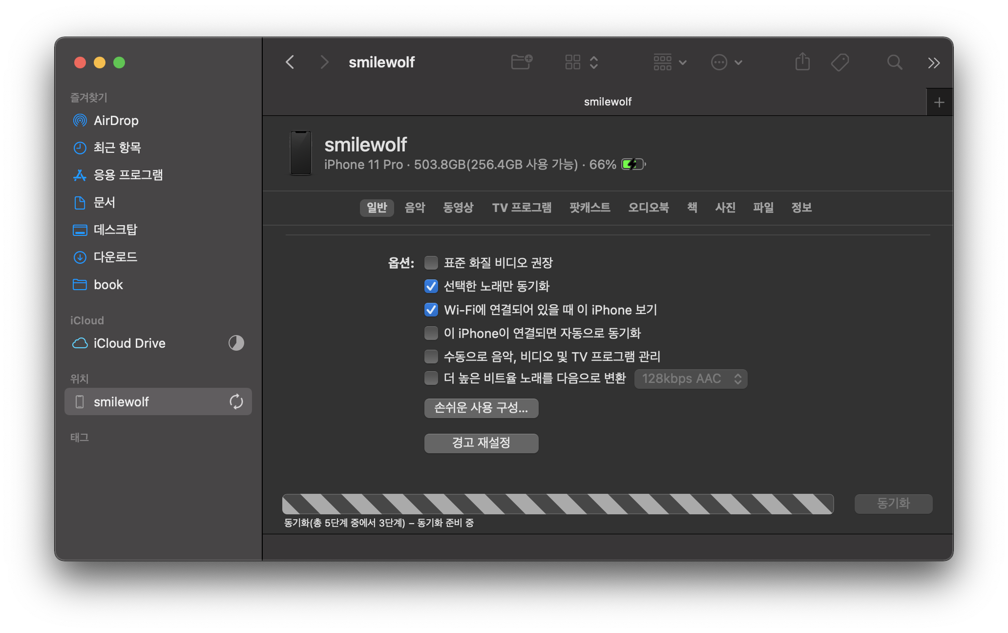 동기화가 끝난 후에 [일반]탭 옆에 있는 [음악]탭으로 들어간다.